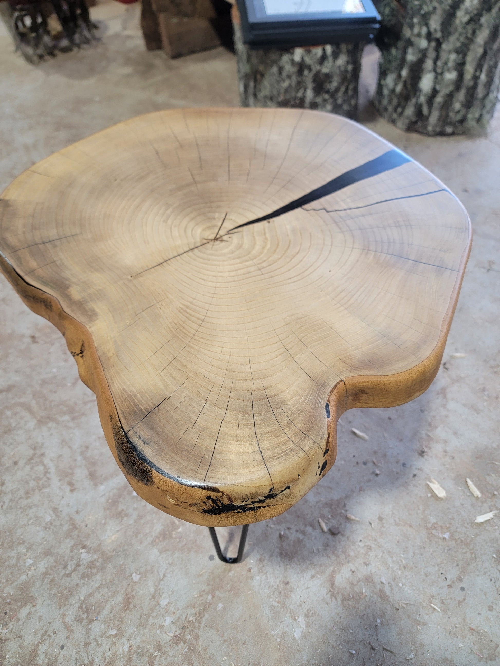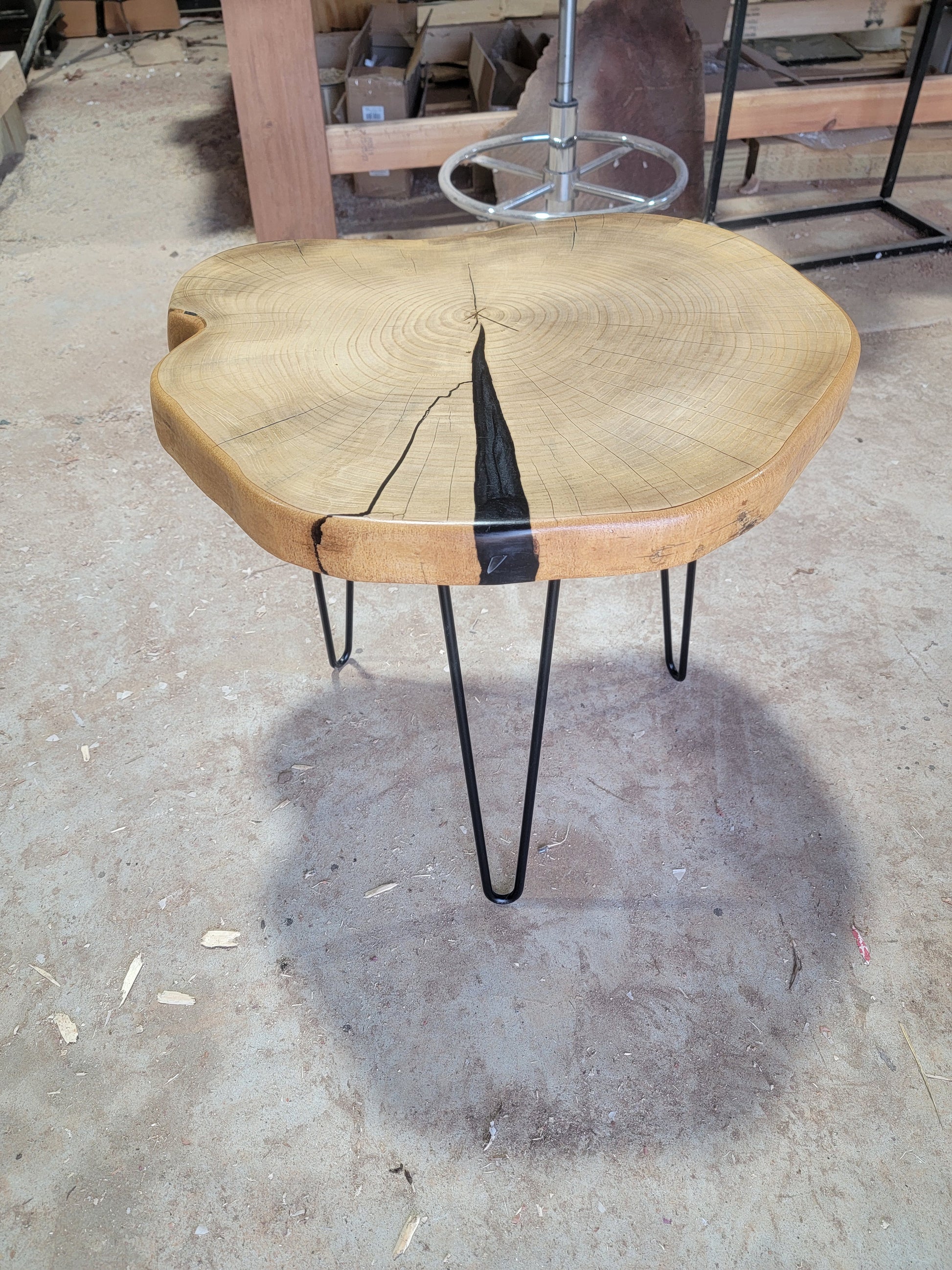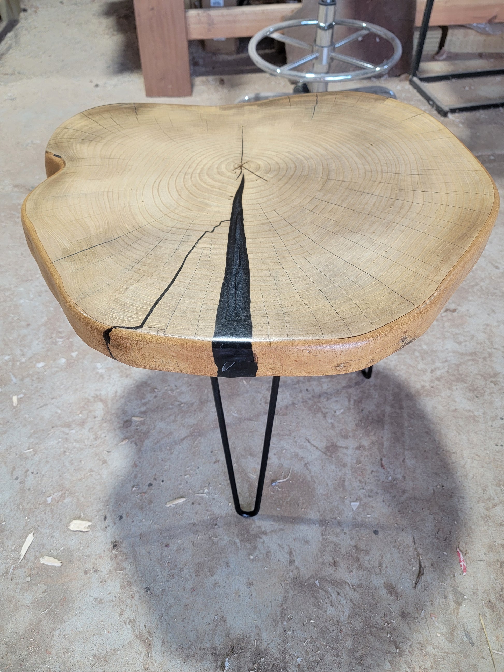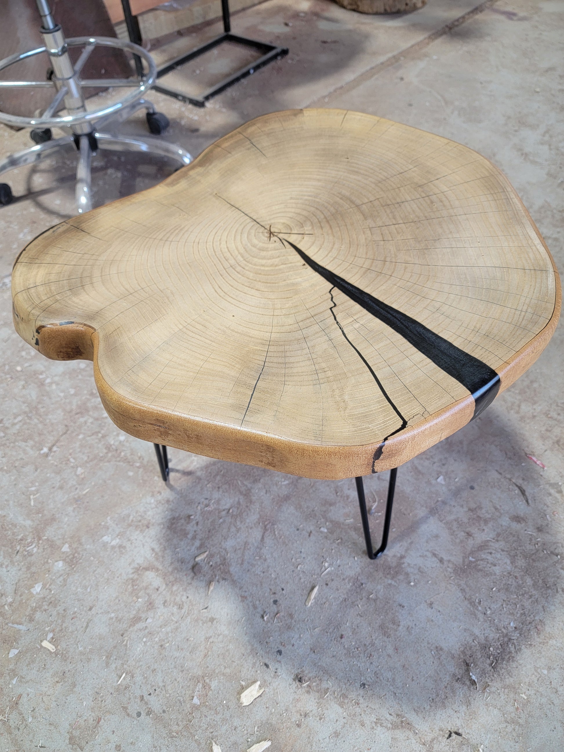 Elevate your space with this Live-Edge Hackberry Side Table, a striking blend of natural beauty and modern design. The rich grain of the Hackberry wood is complemented by a sleek black resin inlay, creating a bold contrast that highlights the wood’s unique character. Supported by sturdy hairpin legs, this table exudes a mid-century charm while showcasing the raw, organic appeal of the live-edge top. Perfect as a statement piece for your living room, bedroom, or entryway, this side table brings both style and functionality to any space. Each table is one-of-a-kind, making it a truly special addition to your home.