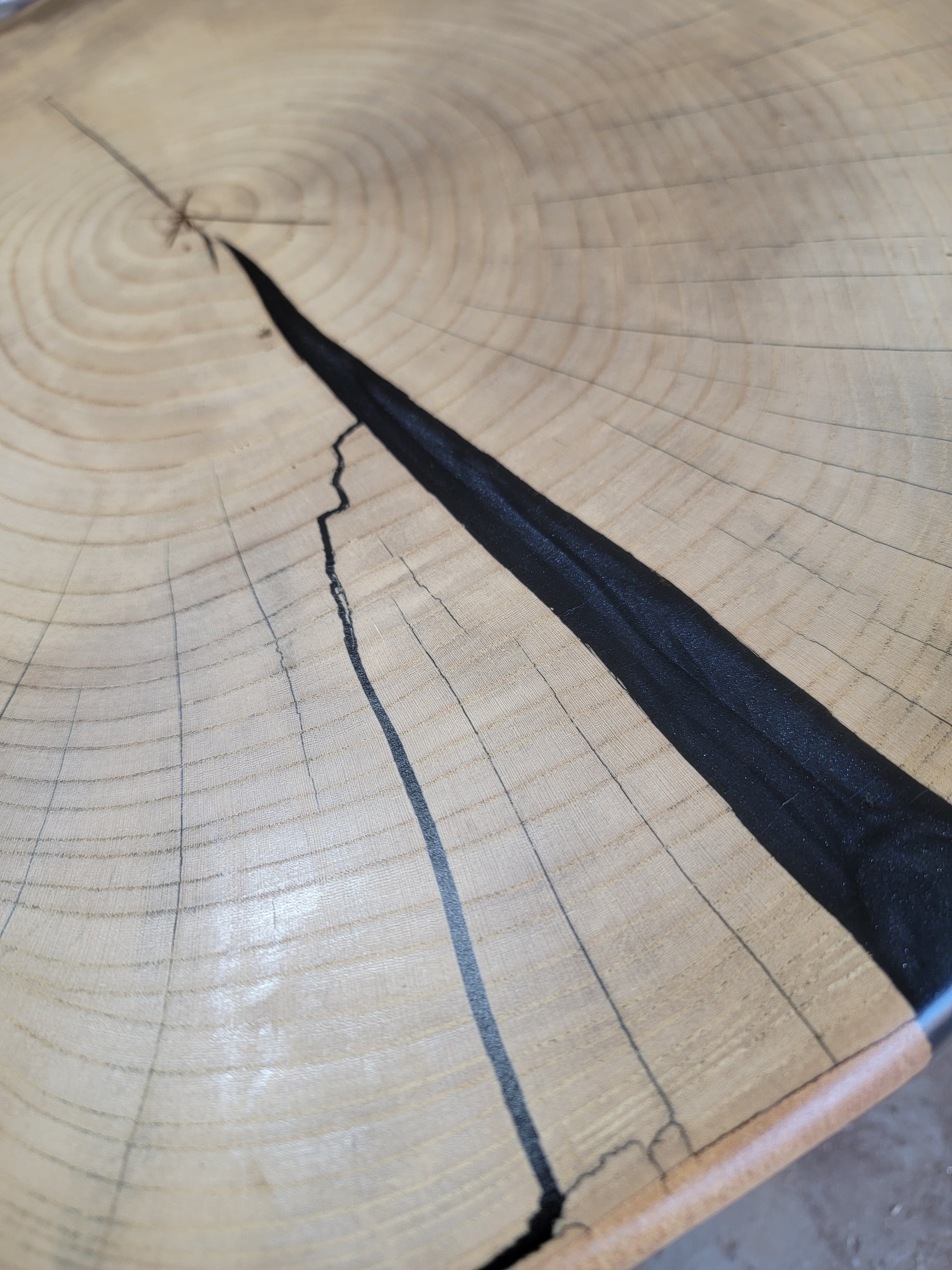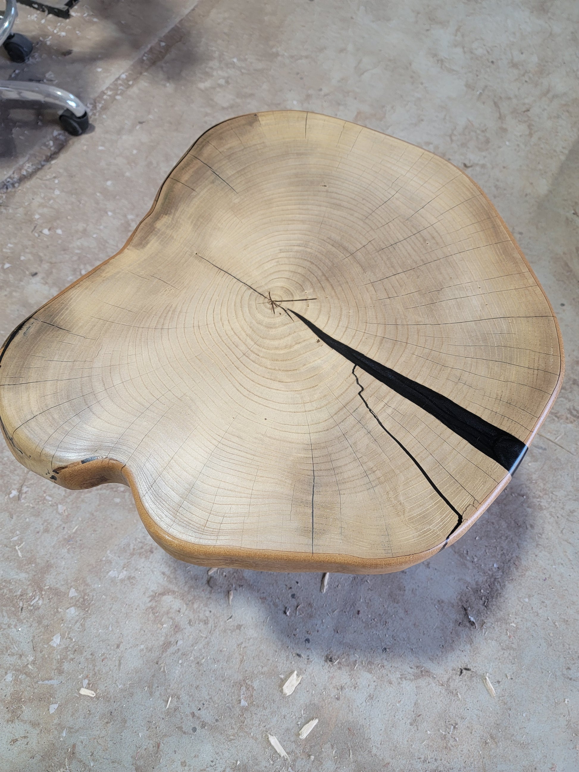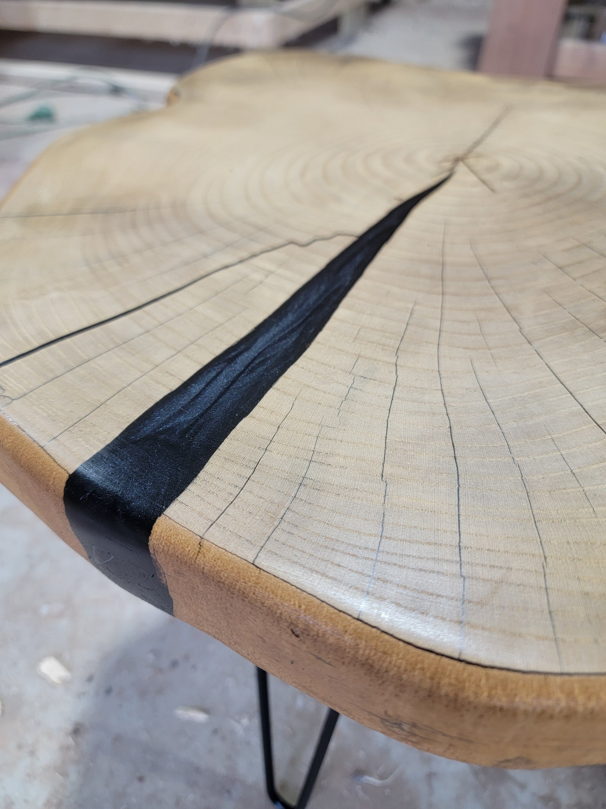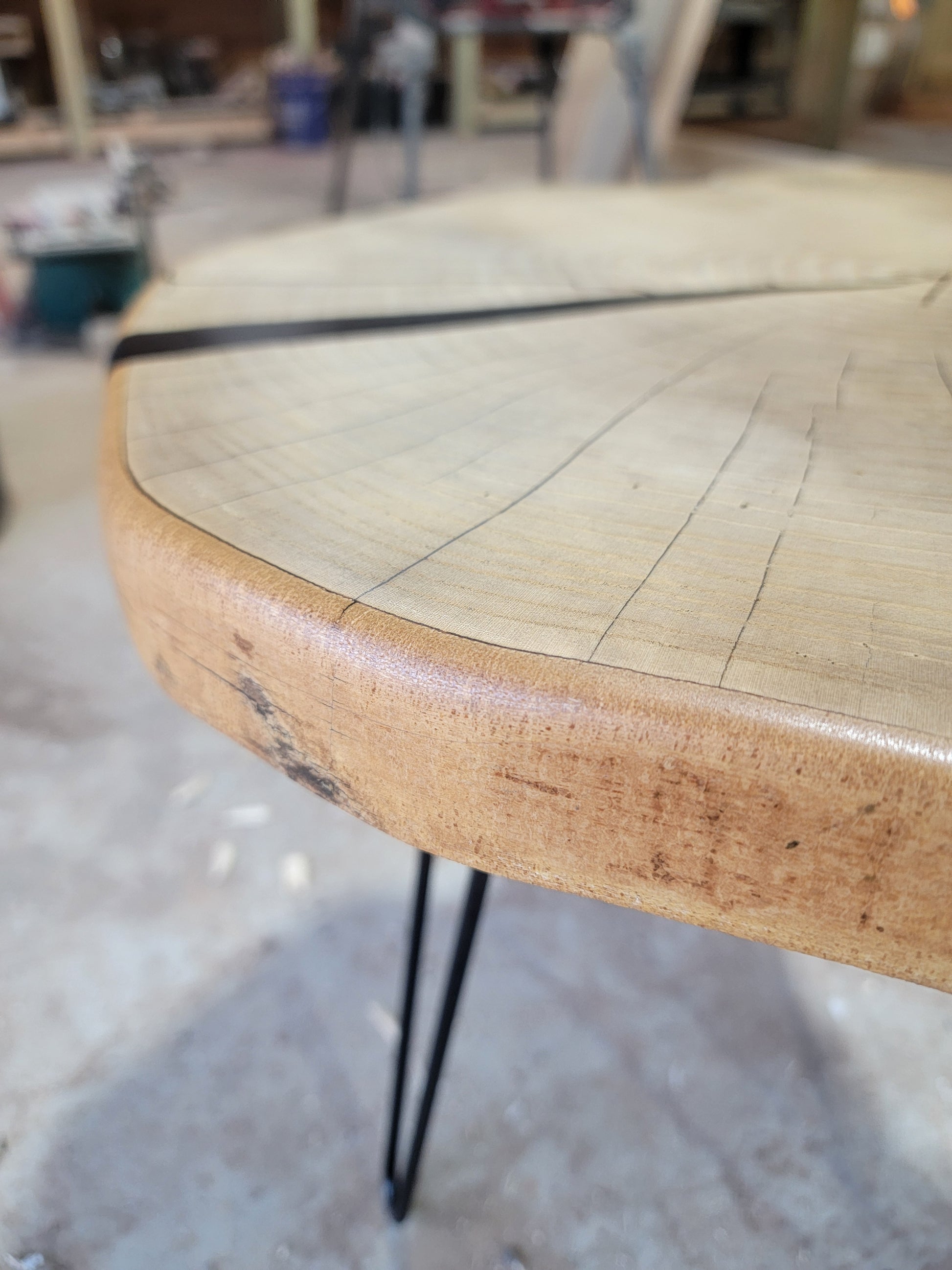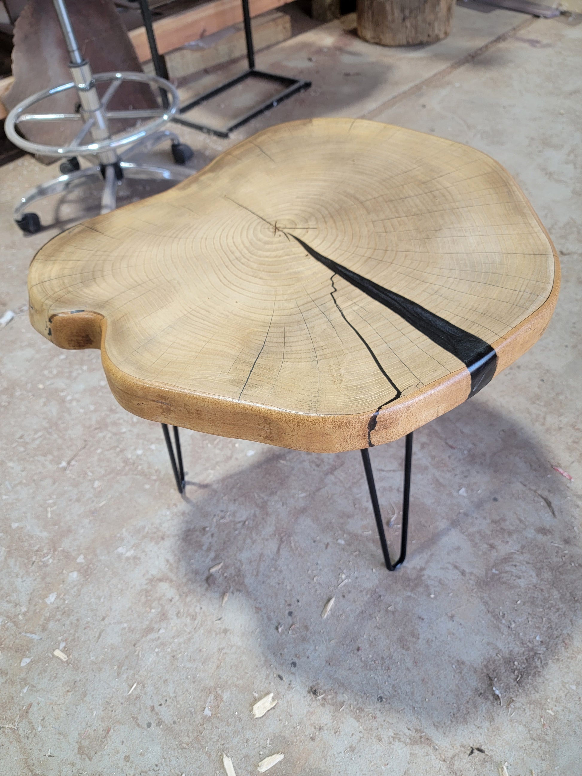 Elevate your space with this Live-Edge Hackberry Side Table, a striking blend of natural beauty and modern design. The rich grain of the Hackberry wood is complemented by a sleek black resin inlay, creating a bold contrast that highlights the wood’s unique character. Supported by sturdy hairpin legs, this table exudes a mid-century charm while showcasing the raw, organic appeal of the live-edge top. Perfect as a statement piece for your living room, bedroom, or entryway, this side table brings both style and functionality to any space. Each table is one-of-a-kind, making it a truly special addition to your home.
